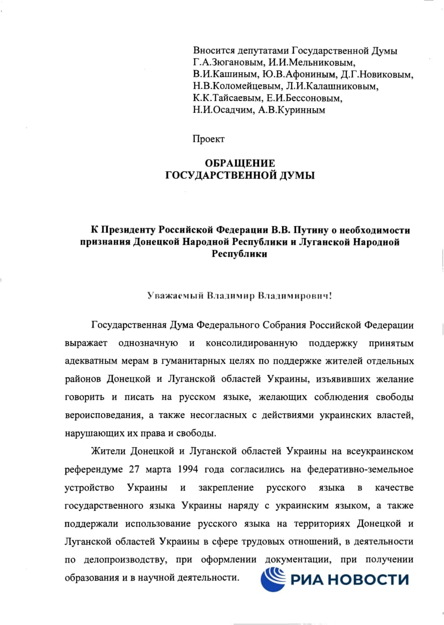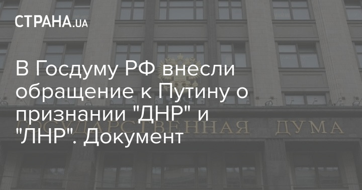 В Госдуму РФ внесли обращение к Путину о признании "ДНР" и "ЛНР". Документ