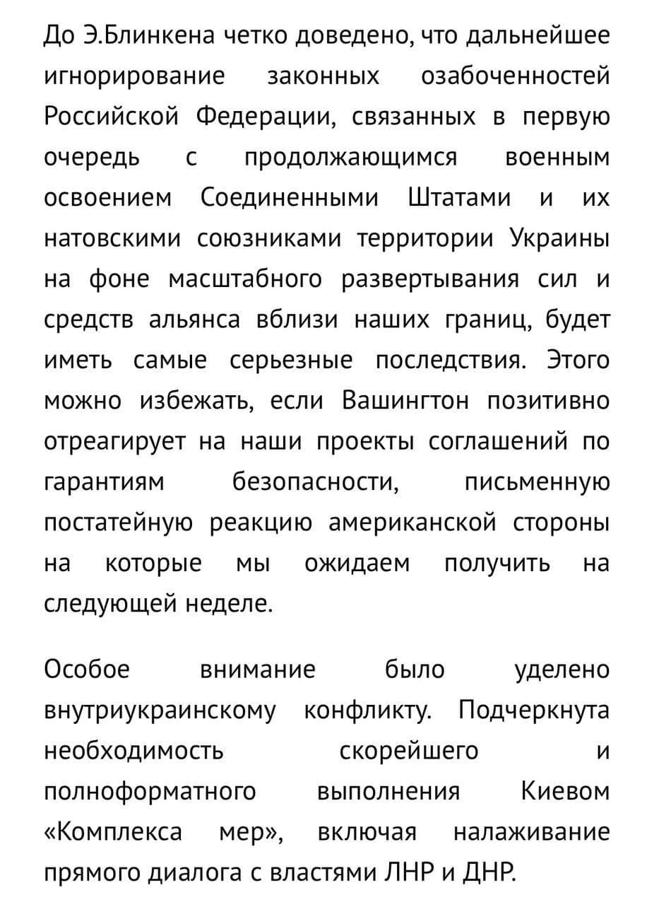 Госсекретарь США сказал, что проведет консультации с Байденом, конгрессом и союзниками по итогам встречи с Лавровым. А также, что Байден готов встретиться с Путиным, если это поможет разрешению кризиса.