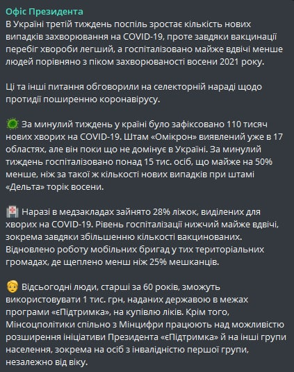 "С сегодняшнего дня люди старше 60 лет смогут использовать 1 тыс. грн, предоставленных государством в рамках программы "Поддержка", на покупку лекарств. Кроме того, Минсоцполитики совместно с Минцифрами работают над возможностью расширения инициативы Президента "Поддержка" и на другие группы населения, в частности лиц с инвалидностью первой группы, независимо от возраста", - говорится в сообщении.
