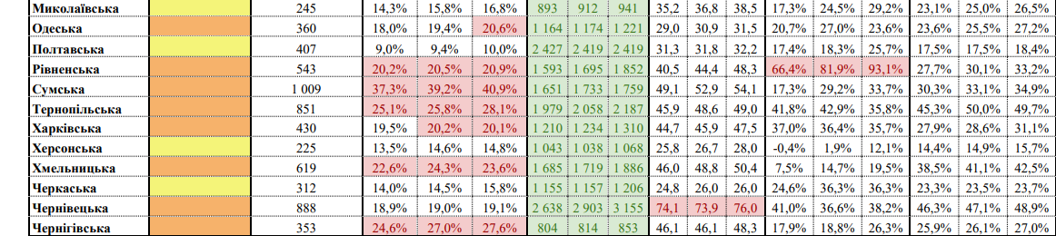 Вчера в оранжевой зоне находились Винницкая, Житомирская, Львовская, Ровенская, Сумская, Тернопольская, Харьковская, Хмельницкая, Черновицкая, Черниговская области. Сегодня же к ним присоединились Волынская, Донецкая, Закарпатская и Одесская области, где ухудшился коэффициент выявления новых случаев Covid-19.