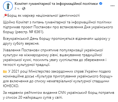 Комитет Верховной Рады Украины по вопросам гуманитарной и информационной политики рекомендовал парламенту принять проект постановления об установлении Дня украинского борща (№6361) в нашей стране.