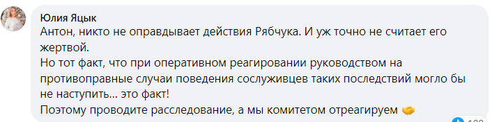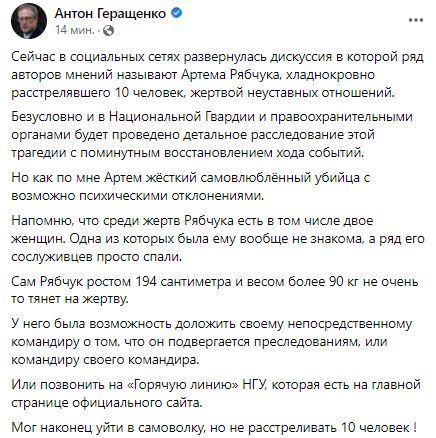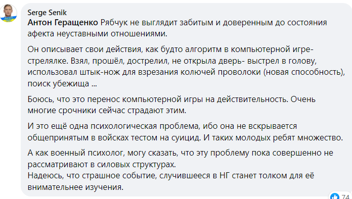 "Сейчас в социальных сетях развернулась дискуссия в которой ряд авторов мнений называют Артема Рябчука, хладнокровно расстрелявшего 10 человек, жертвой неуставных отношений.