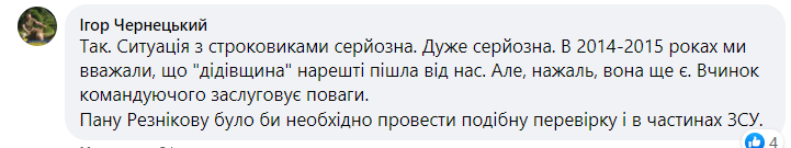"Да. Ситуация со срочниками серьезная. Очень серьезная. В 2014-2015 годах мы считали, что "дедовщина" наконец-то ушла от нас. Но, к сожалению, она еще есть. Поступок командующего заслуживает уважения. Господину Резникову необходимо провести подобную проверку и в частях ВСУ", - пишет ветеран Игорь Чернецкий.