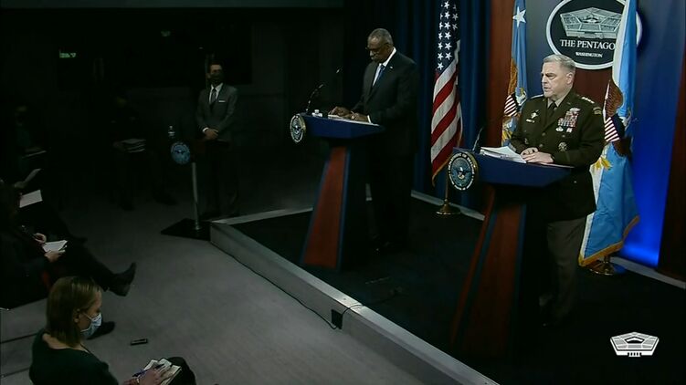 Начальник американского Объединенного комитета начальников штабов Марк Милли, который принимал участие в пресс-конференции Остина, сообщил, что США не имеют постоянных воинских контингентов, баз и наступательных вооружений в Украине.
