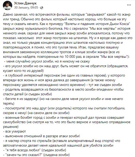 "Давно замечал, что встречаются фильмы, которые "закрывают" какой-то жанр или тренд. Обычно это фильм, который настолько хорош, что больше на эту тему и сказать нечего. Как к примеру "Взлеты и падения: история Дьюи Кокса" закрыл жанр музыкального биопика. Но с сериалом "Мы все мертвы" история немного иная, сериал для меня закрыл жанр зомби апокалипсиса, потому что показал, насколько этот жанр построен на штампах. Ну и я вроде как давно это знал, но только увидев концентрацию этих штампов настолько плотную и повторяющуюся, я понял, что это тухлая тема. Итак, предлагаю вашему вниманию заезженную коллекцию тропов и клише зомби жанра (все из которых вы найдете, повторенные по 10 000 раз, в сериале "Мы все мертвы"):
