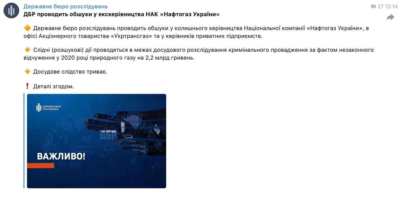Следственные (розыскные) действия проводятся в рамках досудебного расследования уголовного производства по факту незаконного отчуждения в 2020 году природного газа на 2,2 млрд. гривен. Досудебное следствие продолжается", - говорится в сообщении.