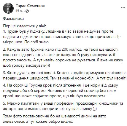 На фото Трухин в рубашке, хотя в момент ДТП был в пиджаке. Кроме того, если авто нардепа ехало со скоростью под 200 км/ч, как говорят, то в таком случае окно вообще не открывают, не говоря уже о том, чтобы высовывать руку.