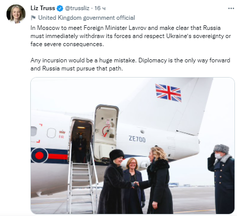 "В Москве я встречусь с министром иностранных дел Лавровым и дам понять, Россия должна немедленно вывести свои войска и уважать суверенитет Украины, иначе ее ждут серьезные последствия. Любое вторжение было бы огромной ошибкой. Дипломатия - единственный путь вперед, и Россия должна идти по этому пути", - написала Трасс в Twitter.