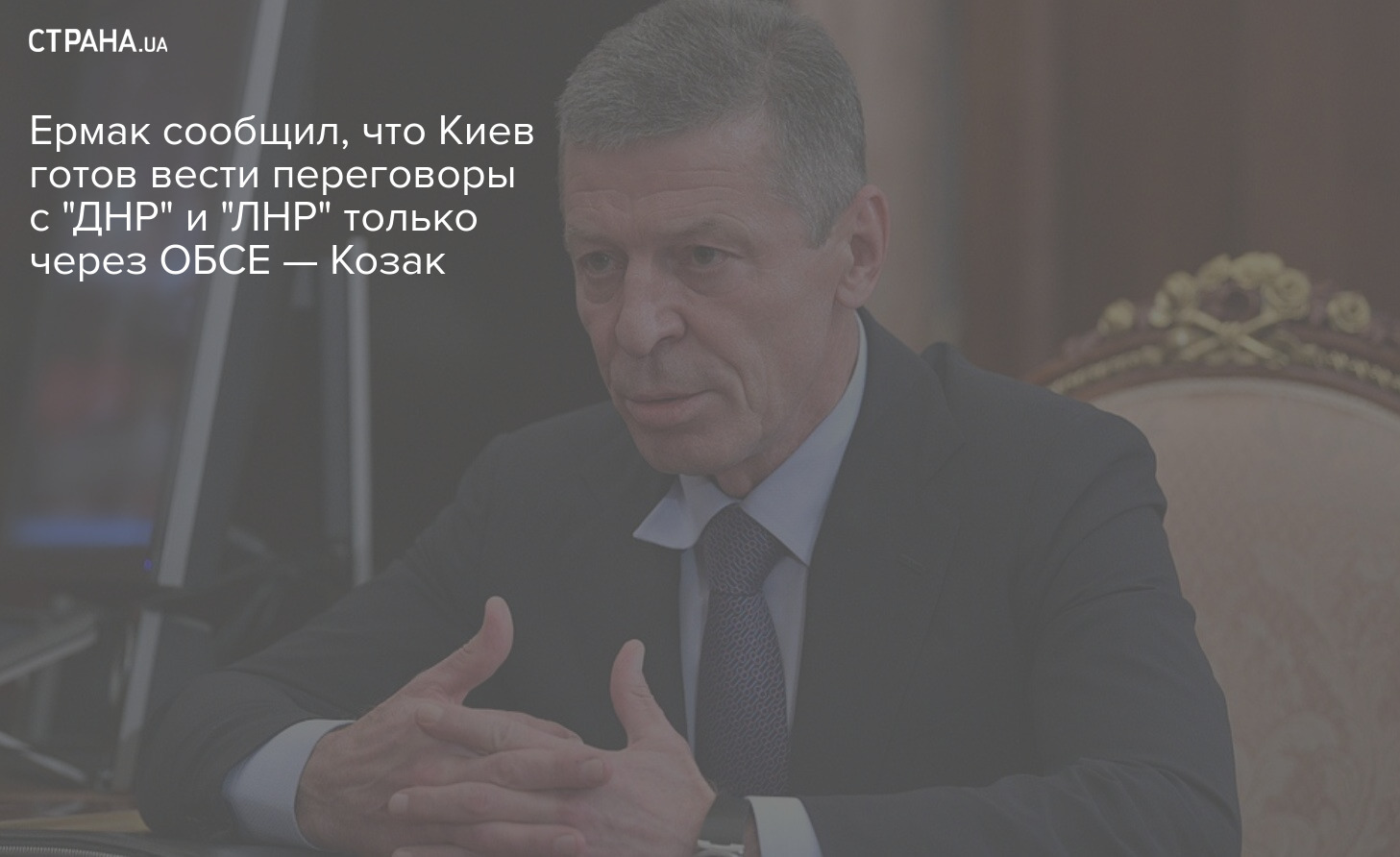 Заместитель руководителя Администрации президента Российской Федерации Дмитрий Козак рассказал о том, что на прошедших в Берлине переговорах политических советников лидеров стран Нормандской четверки (Украина, Россия, Германия, Франция) Киев заявил о готовности вести переговоры с "ДНР" и "ЛНР" только через ОБСЕ.