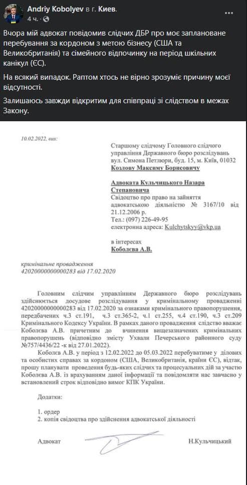 Несмотря на то, что он является фигурантом дела о незаконной передаче газа коммерческим структурам на 2,2 миллиарда гривен, Коболев на своей странице в Facebook сообщил, что почти на месяц (до 5 марта) уезжает за границу.