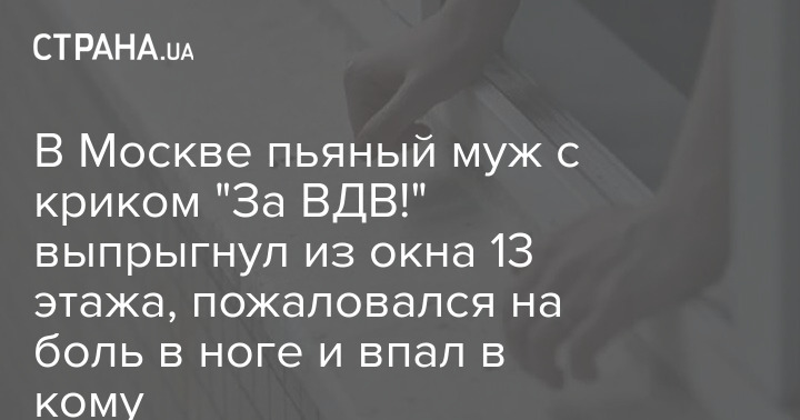 На севере Москвы из окна 13-го этажа с криком "За ВДВ!" выпрыгнул пьяный мужчина - уроженец Курской области. Он приземлился в сугроб, стал жаловаться на боль в ноге, а затем впал в кому.
