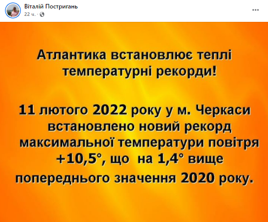 "Атлантика устанавливает новые теплые рекорды. 11 февраля в Черкассах установлен новый рекорд максимальной температуры воздуха за все время наблюдений для этого дня. Термометры показали +10,5. Это на 1,4 градуса выше предыдущего рекорда +9,1, который был в 2020 году", - написал Постригань.