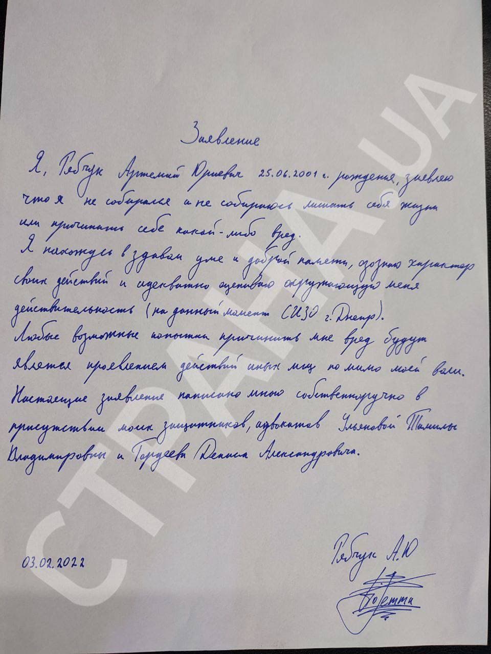 "Я, Рябчук Артемий Юриевич, 25.06.2001 г.р., заявляю, что я не собирался и не собираюсь лишать себя жизни или причинить себе какой-либо вред. Я нахожусь в здравом уме и доброй памяти. Осознаю характер своих действий и адекватно оцениваю окружающую меня действительность, на данный момент находясь в следственном изоляторе города Днепр. Любые возможные попытки причинить мне вред будут являться проявлением действий иных лиц помимо моей воли. Настоящее заявление написано мной собственноручно в присутствии плиз защитников, адвокатов Ульяновой Тамилы Владимировны и Гордеева Дениса Александровича".