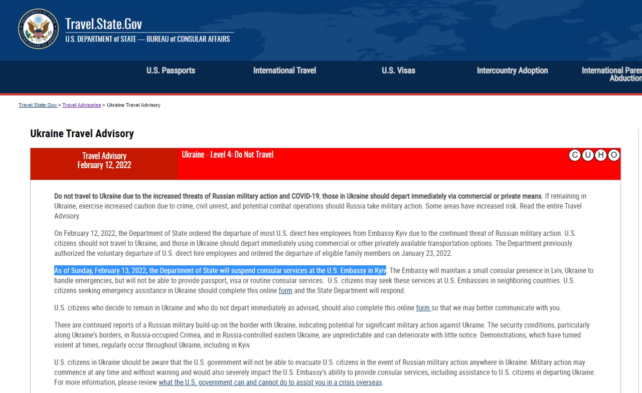 "С воскресенья, 13 февраля, Государственный департамент приостанавливает консульские услуги в посольстве США в Киеве. Посольство сохранит небольшое консульское присутствие во Львове, для решения чрезвычайных ситуаций, но не сможет предоставлять паспортные, визовые или обычные консульские услуги. Граждане США могут обращаться за этими услугами в посольства США в соседних странах. Граждане США, которым требуется экстренная помощь в Украине, должны заполнить эту онлайн-форму, и Государственный департамент ответит". - говорится в сообщении.