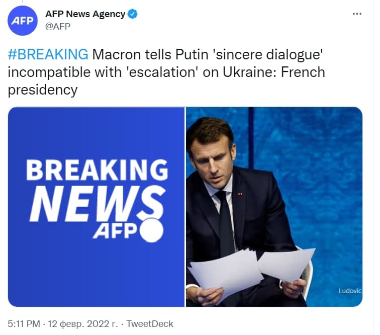 "Президент Франции Эммануэль Макрон провел в субботу переговоры со своим российским коллегой Владимиром Путиным в течение часа и 40 минут, чтобы попытаться ослабить растущую напряженность в российско-украинском кризисе", – говорится в сообщении агентства.