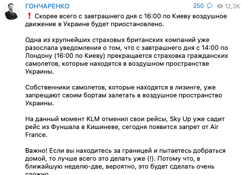 "Скорее всего с завтрашнего дня с 16:00 по Киеву воздушное движение в Украине будет приостановлено. Одна из крупнейших страховых британских компаний уже разослала уведомления о том, что с завтрашнего дня с 14:00 по Лондону (16:00 по Киеву) прекращается страховка гражданских самолетов, которые находятся в воздушном пространстве Украины", - написал Гончаренко.