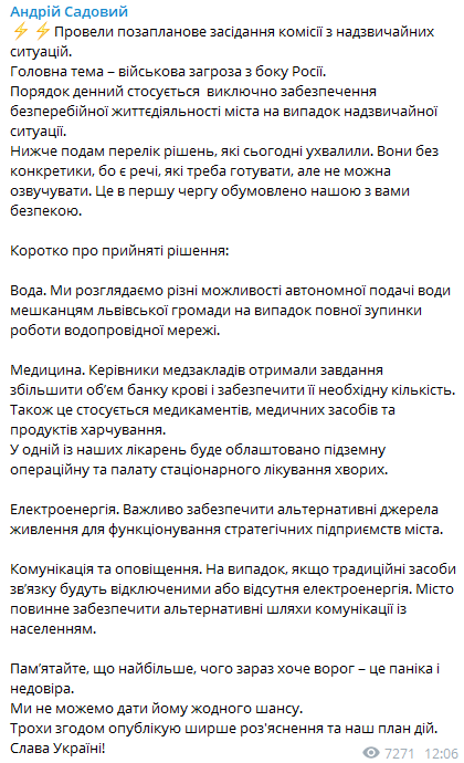Во Львове провели внеплановое заседание комиссии чрезвычайных ситуаций. На повестке дня стоял план действий города на случай вторжения Российской Федерации в Украину.
