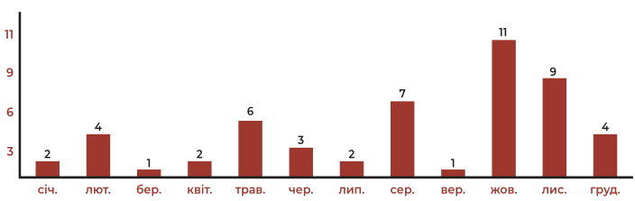 А вот график, который показывает динамику количества случаев антисемитизма в Украине за 2021 год по месяцам.