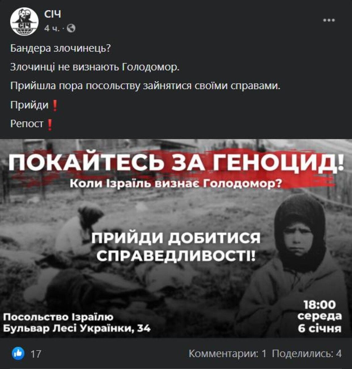 Например, в начале января ультраправые из С14 вышли под посольство Израиля в Украине и потребовали "покаяться за Голодомор". И таких примеров масса, если покопаться в призывах ультраправых групп.
