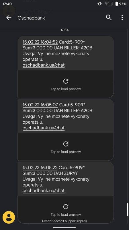 После транзакции на смартфон приходит сообщение о том, что клиент не может выполнить операцию.