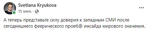 "А теперь представьте силу доверия к западным СМИ после сегодняшнего феерического проеб@ инсайда мирового значения", - написала заместитель главного редактора "Страны" Светлана Крюкова.