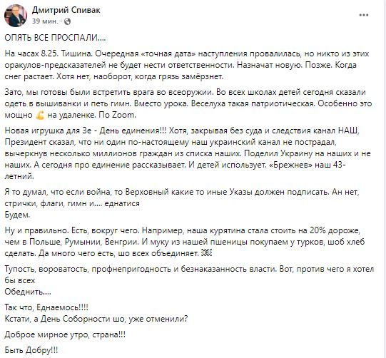 Так что, Еднаемось!!!! Кстати, а День Соборности шо, уже отменили. Доброе мирное утро, страна!!! Быть Добру!!!" - написал телеведущий Дмитрий Спивак.
