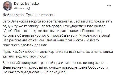 Зеленский придумал странный праздник в честь не вторжения - День единения, который по смыслу повторяет день Соборности. Но как его праздновать - не придумал" - написал директор информагентства "Украинские новости" Денис Иванеско.