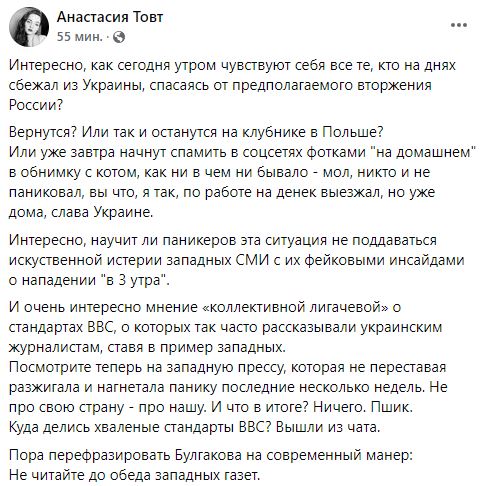 "Интересно, как сегодня утром чувствуют себя все те, кто на днях сбежал из Украины, спасаясь от предполагаемого вторжения России? Вернутся? Или так и останутся на клубнике в Польше?