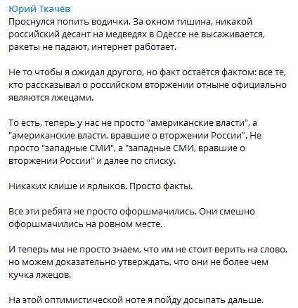 На этой оптимистической ноте я пойду досыпать дальше" - написал журналист Юрий Ткачев.