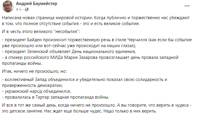 Украинский философ Андрей Баумейстер пишет, что весь мир пытается продать Украине "отсутствие события".