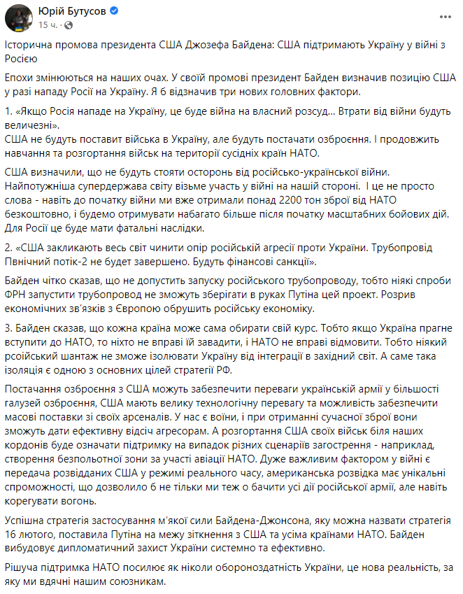 "Успешная стратегия применения мягкой силы Байдена-Джонсона, которую можно назвать стратегия 16 февраля, поставила Путина на грань столкновения с США и всеми странами НАТО. Байден выстраивает дипломатическую защиту Украины системно и эффективно", - заявил Бутусов.
