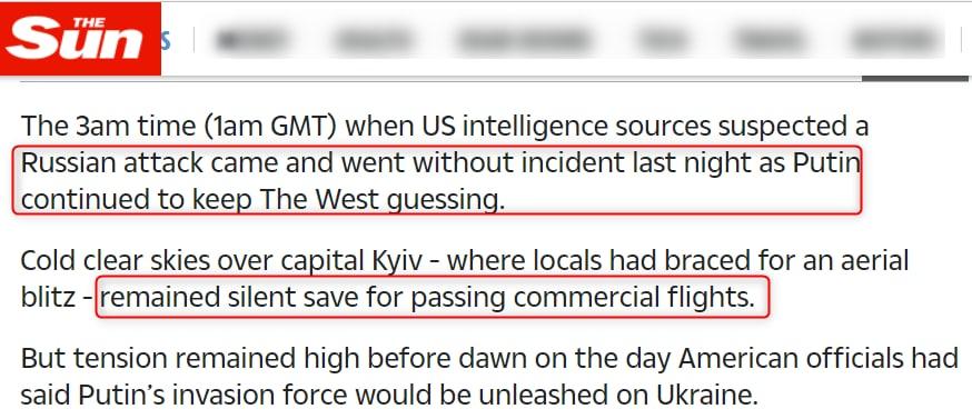Как оправдываются западные СМИ. Таблоид The Sun, который накануне заявил, что "вторжение" состоится в три часа ночи, отредактировал свою знаменитую статью. Теперь там говорится, что ночь, когда должна была состояться атака России, прошла без происшествий.