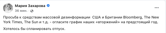 "Просьба к средствам массовой дезинформации США и Британии Bloomberg, The New York Times, The Sun и т.д. - огласите график наших "вторжений" на предстоящий год. Хотелось бы спланировать отпуск", — написала Захарова в фейсбуке.