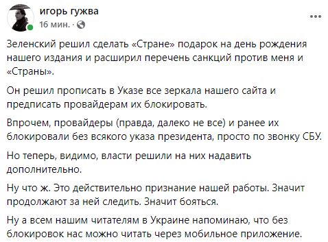 Ну а всем нашим читателям в Украине напоминаю, что без блокировок нас можно читать через мобильное приложение", - написал Игорь Гужва.