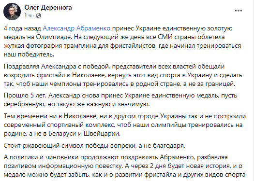 А политики и чиновники продолжают поздравлять Абраменко, разбавляя позитивом информационную повестку. А через 2 дня будет новая история, и о медале можно будет забыть, как и о развитии фристайла и других видов спорта", - написал Деренюга.
