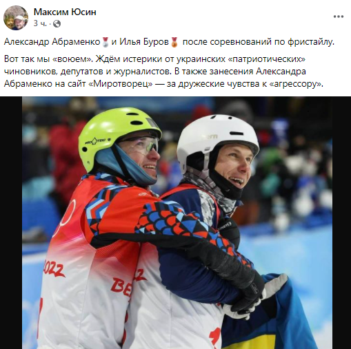 "Александр Абраменко и Илья Буров после соревнований по фристайлу. Вот так мы "воюем". Ждём истерики от украинских "патриотических" чиновников, депутатов и журналистов. В также занесения Александра Абраменко на сайт "Миротворец" - за дружеские чувства к "агрессору", - так прокомментировал снимок журналист российского издания "Коммерсант" Максим Юсин.