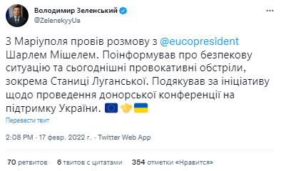 "Из Мариуполя провел разговор с президентом Европейского Совета Шарлем Мишелем. Проинформировал о ситуации безопасности и сегодняшних провокационных обстрелах, в частности Станицы Луганской. Поблагодарил за инициативу о проведении донорской конференции в поддержку Украины", - написал Зеленский.