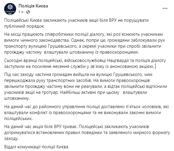 По данным правоохранителей, во время протеста часть граждан вышла на проезжую часть улицы Грушевского и препятствовала движению транспортных средств.