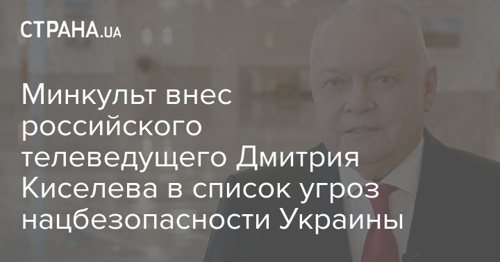 Министерство культуры и информационной политики Украины внесло в список лиц, создающих угрозу нацбезопасности, гендиректора информагентства "Россия сегодня" и ведущего "Вестей недели" на "России 1" Дмитрия Киселева, как ранее просил Нацсовет по ТВ.