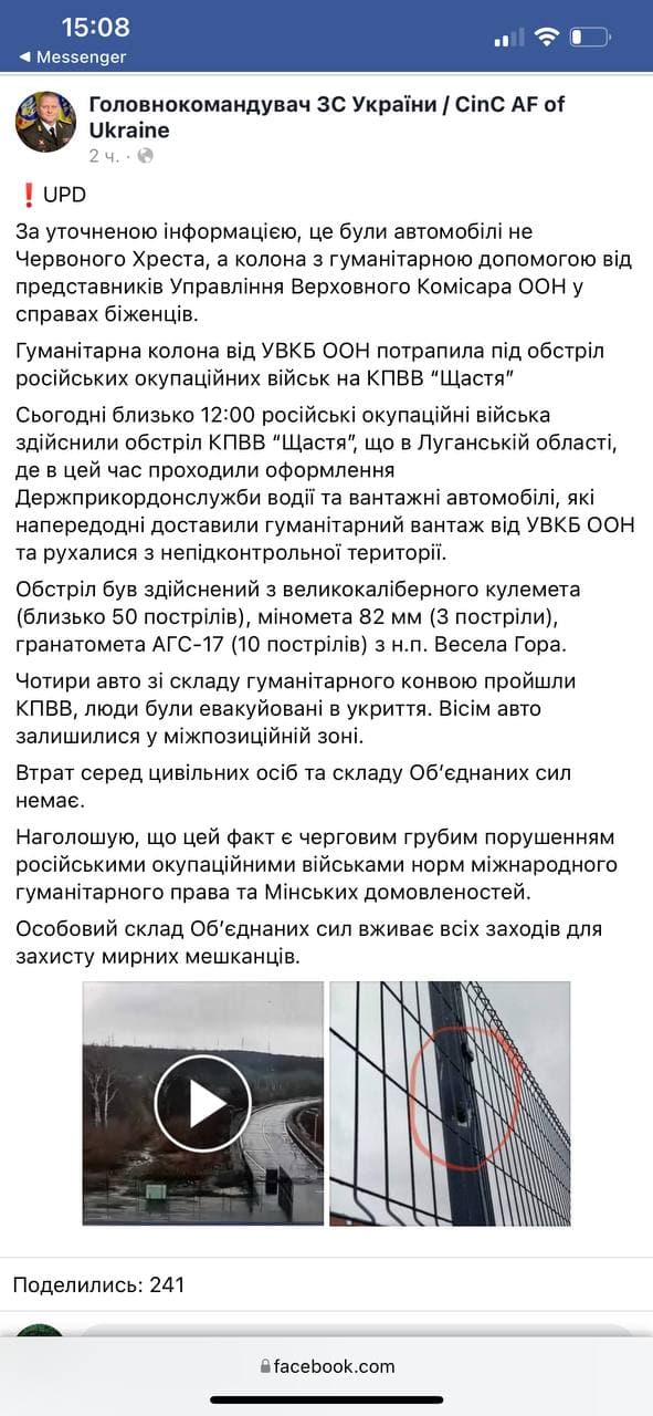 Залужный написал, что на КПВВ в момент обстрела были не автомобили Красного креста, а колонна с гуманитарной помощью Управления Верховного комиссара ООН по делам беженцев.