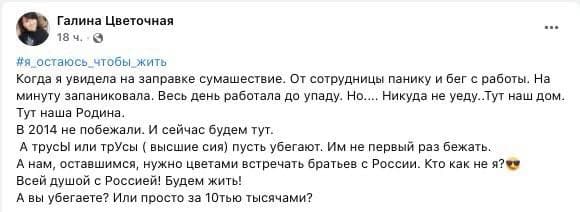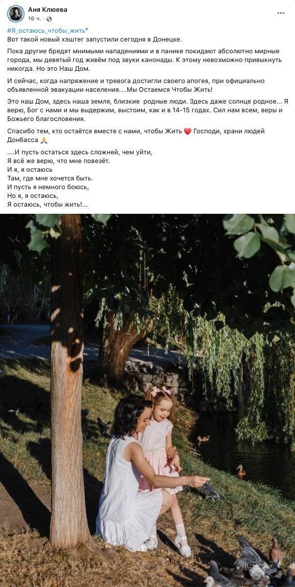 На фоне массовой эвакуации на Донбассе некоторые жители "ДНР" отказались уезжать в Россию и запустили в соцсетях флешмоб с хэштегами — "я остаюсь" и "я остаюсь, чтобы жить".