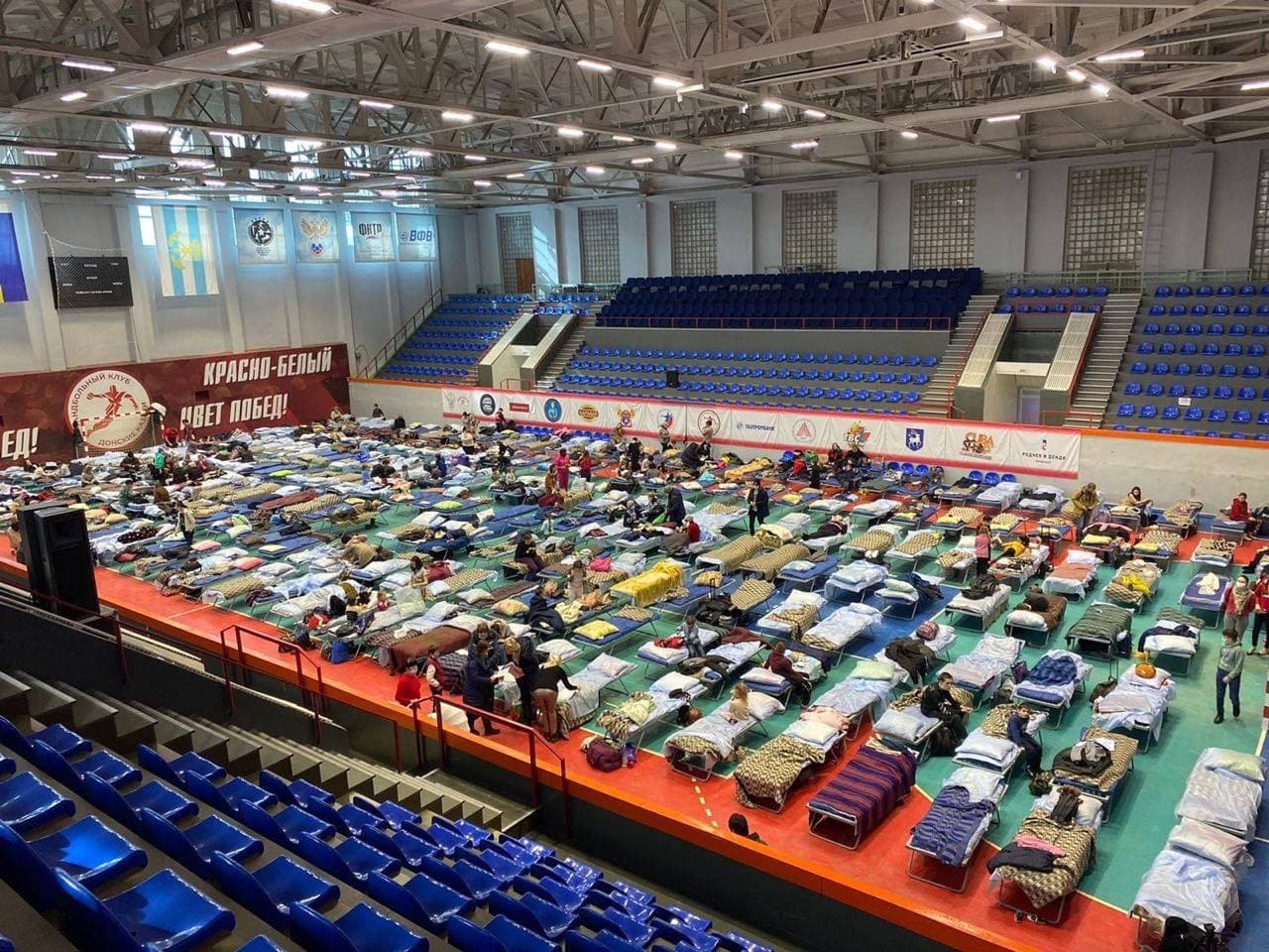Есть те, кому повезло меньше. Их селят в российские школы или дворцы спорта. Фотографии таких временных пристанищ вчера облетели Сеть. На одном из фото - стройные ряды раскладушек прямо на стадионе.