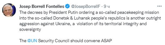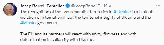 "Признание двух сепаратистских территорий в Украине является вопиющим нарушением международного права, территориальной целостности Украины и минских соглашений. ЕС и его партнеры дадут единый, твердый и решительный ответ в знак солидарности с Украиной", - говорится в твите главного дипломата ЕС.