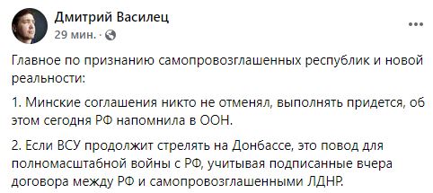 2. Если ВСУ продолжит стрелять на Донбассе, это повод для полномасштабной войны с РФ, учитывая подписанные вчера договора между РФ и самопровозглашенными ЛДНР" - написал журналист Дмитрий Василец.