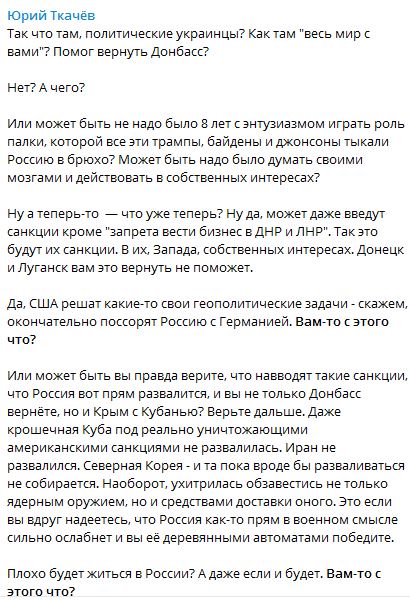 Я ведь не шутил и не преувеличивал, когда писал, что плохо быть иностранной колонией. И можете сколько угодно рассказывать про "кремлёвские нарративы". Рассказы это хорошо. Но есть реальность. Вот вам конкретная ситуация с Донбассом. Которая разрулилась в чьих угодно интересах, но только не в интересах украинского государства" - написал журналист Юрий Ткачев.