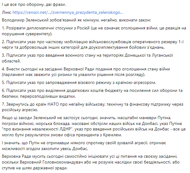 Главред сайта "Цензор" Юрий Бутусов потребовал у Зеленского разорвать дипломатические отношения с Россией, начать частичную мобилизацию, ввести военное положение на Донбассе, установить визовый режим с Россией и обратиться к НАТО с просьбой о немедленной военной помощи.