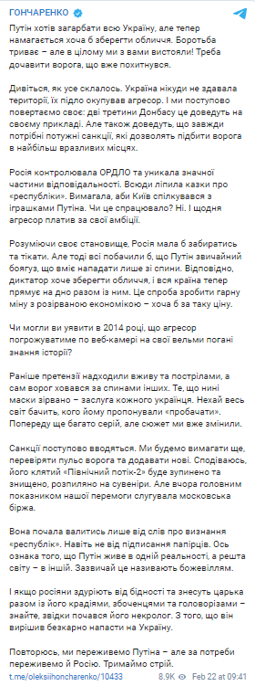 Обращение оказалось выдержанным в спокойных тонах. Конечно, Зеленский заявил, что Россия нарушила территориальную целостность Украины. Но тут же отметил, что "Россия легализует свои войска, фактически находившиеся в оккупированных районах Донбасса с 2014 года".
