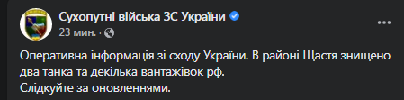 "Оперативная информация с востока Украины. В районе Счастья уничтожены два танка и несколько грузовиков РФ", - говорится в сообщении.
