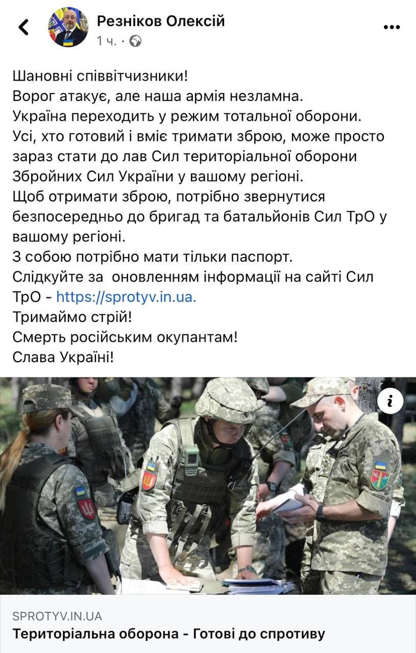 "Враг атакует, но наша армия несокрушима. Украина переходит в режим полной обороны. Все, кто готов и умеет держать оружие, может прямо сейчас вступить в ряды Сил территориальной обороны Вооруженных Сил Украины в вашем регионе. Чтобы получить оружие, обратитесь непосредственно к бригадам и батальонам Сил ТрО в вашем регионе. С собой нужно иметь только паспорт", - говорится в сообщении министра.