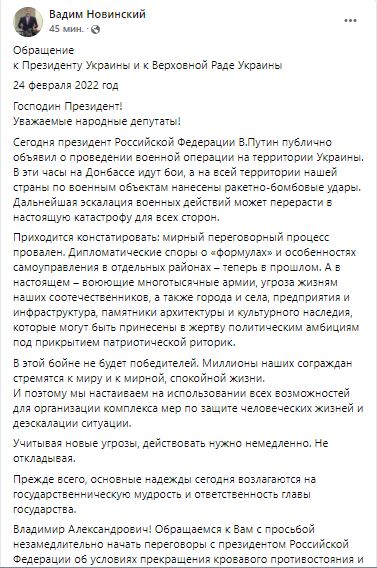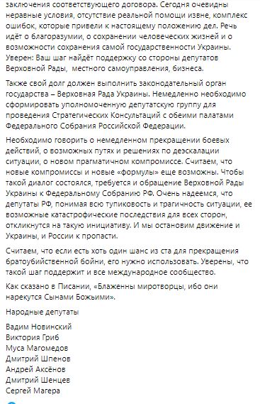 Обращаемся к Вам с просьбой незамедлительно начать переговоры с президентом Российской Федерации об условиях прекращения кровавого противостояния и заключения соответствующего договора. Сегодня очевидны неравные условия, отсутствие реальной помощи извне, комплекс ошибок, которые привели к настоящему положению дел. Речь идёт о благоразумии, о сохранении человеческих жизней и о возможности сохранения самой государственности Украины", - написали депутаты.